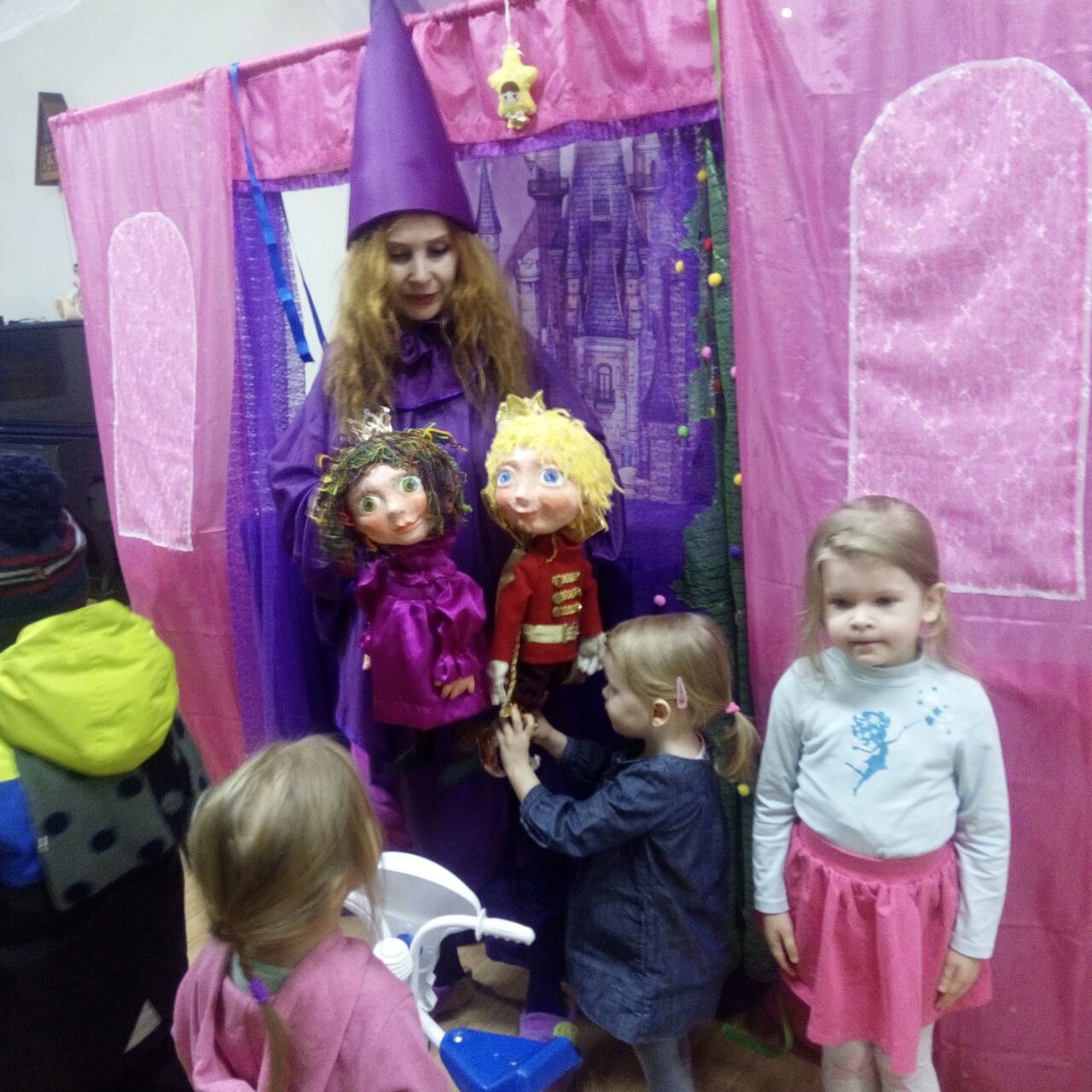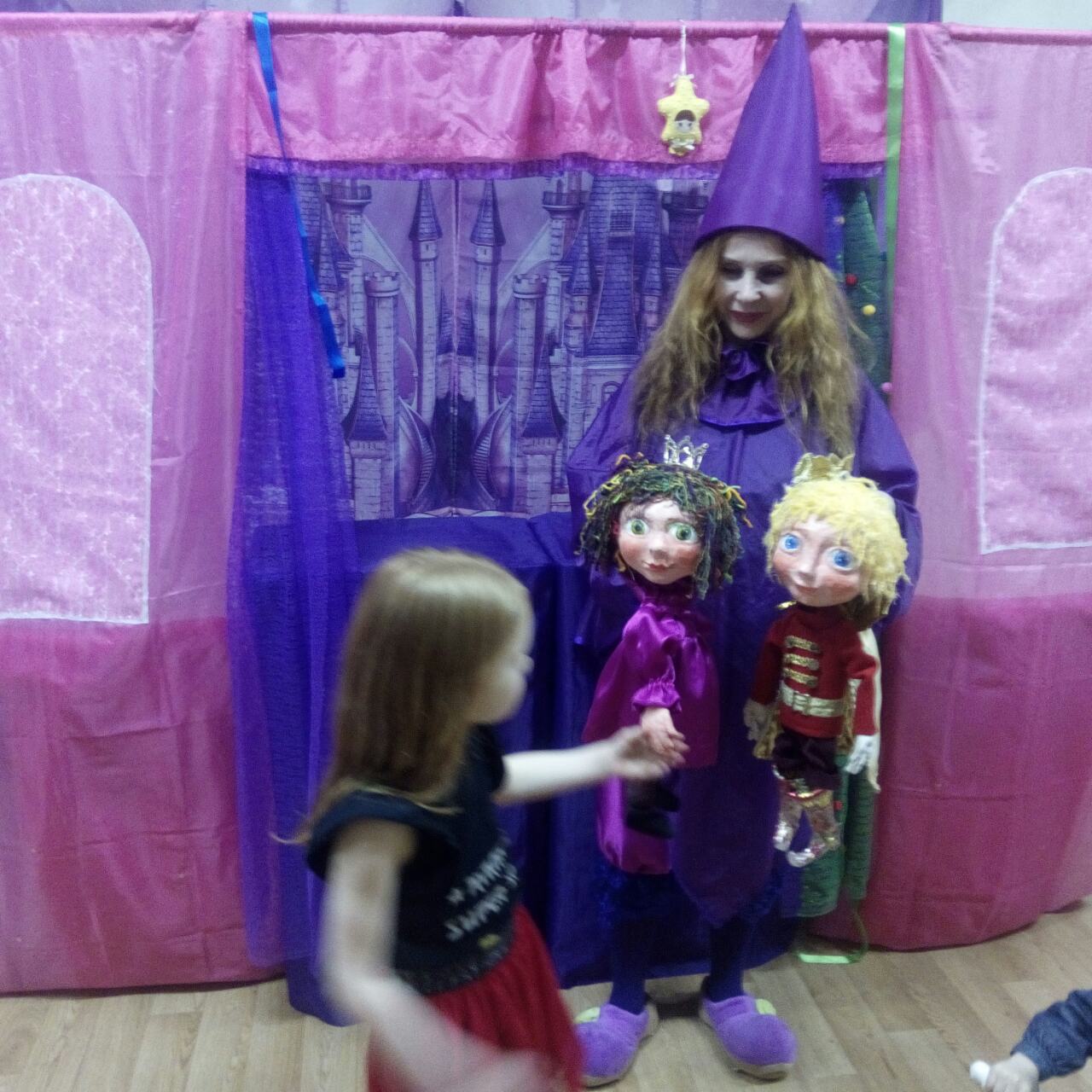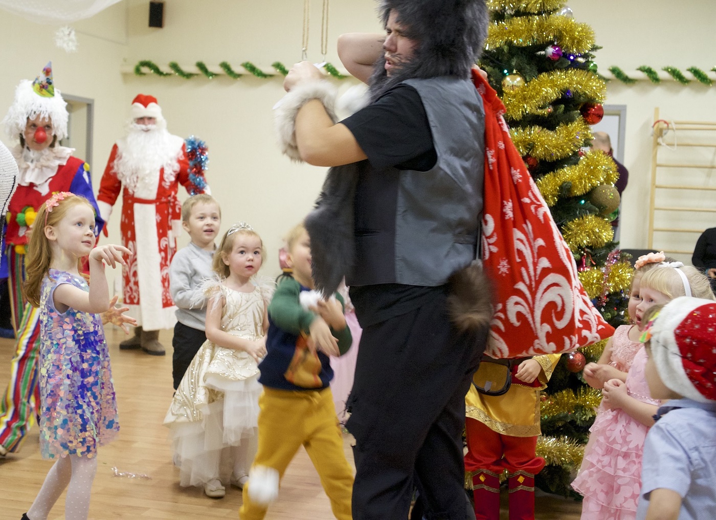 Со злым волком, который обязательно станет добрым, волшебницей, которая приехала из далеких стран и разговаривает только по-английски, игривым клоуном, и конечно с Дедом Морозом и Снегурочкой.