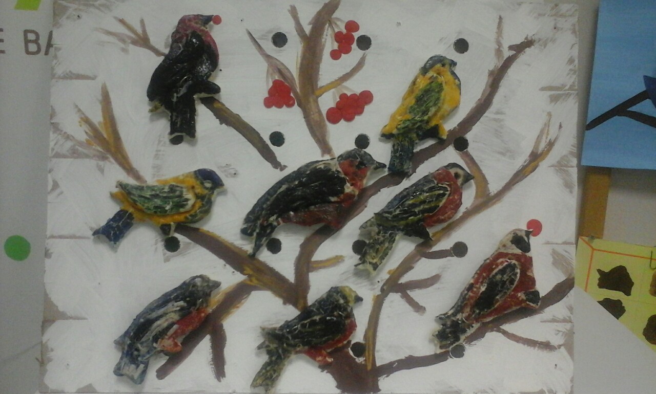 Нарисовали дерево и каждый ребенок посадил на веточку своего снегиря из теста.