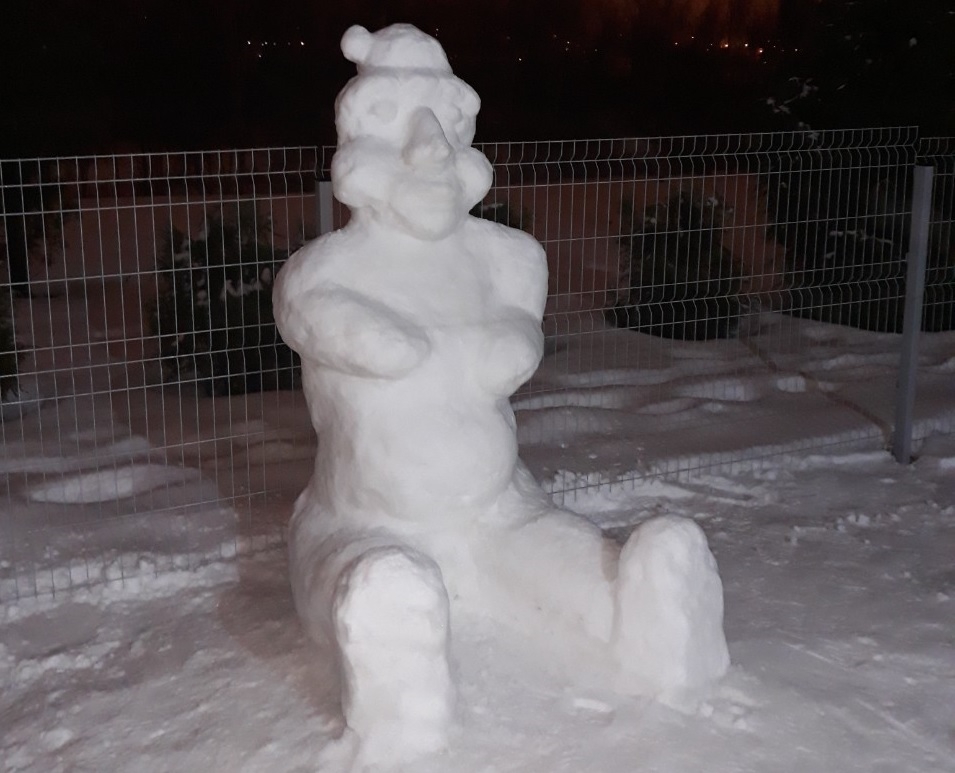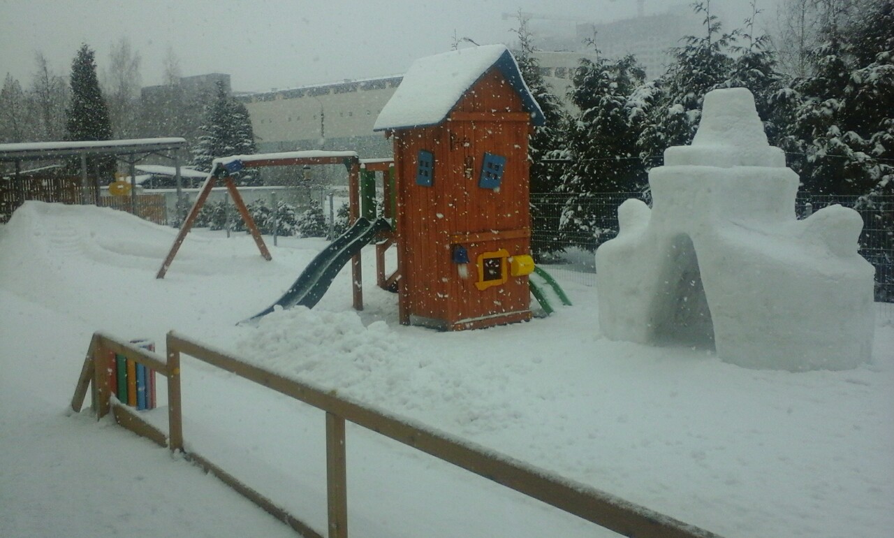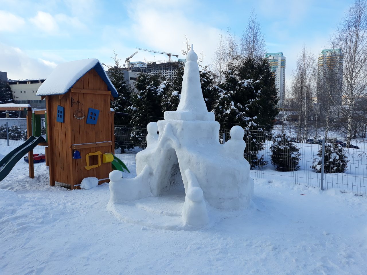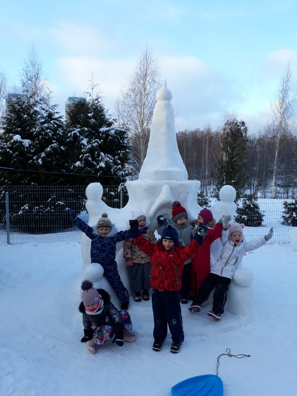 А мы построили совместно с детьми ледовый замок, ледяную горку с лестницей, снеговика и крепость из снежных кирпичей.